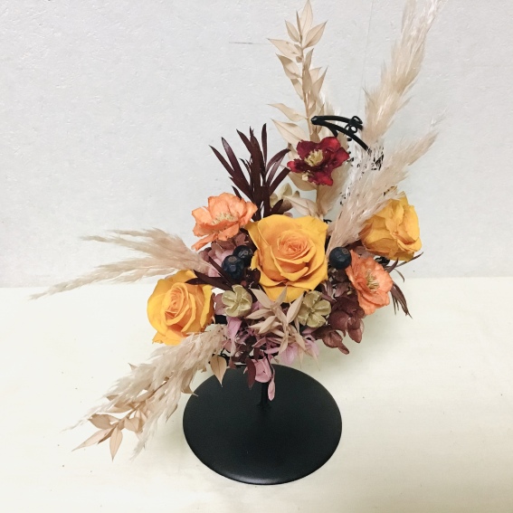 ベースと花材のカラーリング、風合いも秋らしいテイストです。