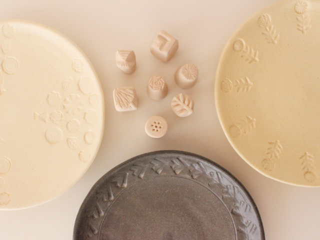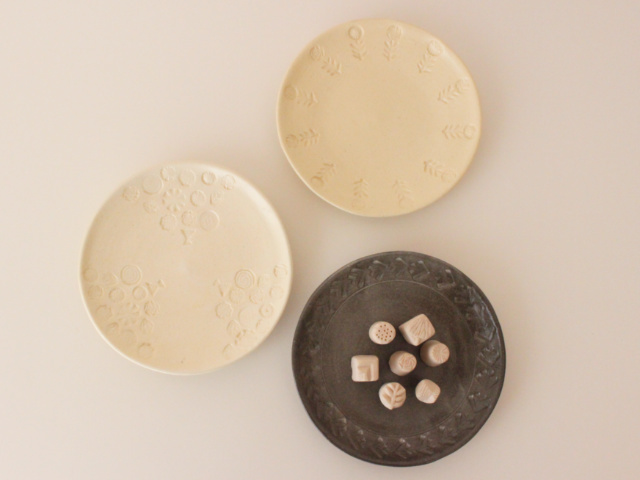 手回しロクロの上にひも状にした土を積み上げてつなげる「ひもづくり」という技法でお皿をつくります。出来たお皿にお花ハンコで模様をいれて完成です。