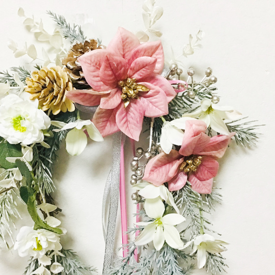 パールピンクのポインセチアをメインに、グレイッシュなモミやファーン、パールホワイトのユーカリ、バラなどを合わせて、ベリーやマツカサをアクセントにした、馬蹄型のクリスマスリースを作ります。