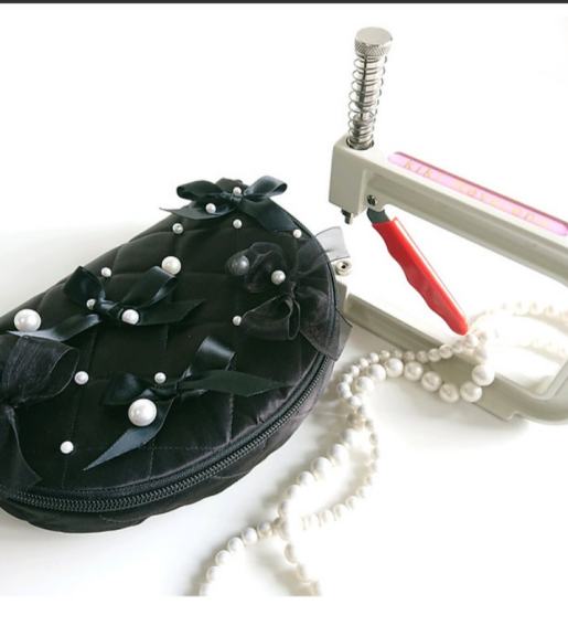 ハンドメイド初心者も簡単に装着できる専用の機械を使ってホチキスのようにパール打ち付け機械で、手持ちのアイテムを簡単にパールやパーツで装飾します。