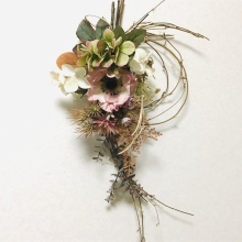 ドライフラワーテイストの花(ドライフラワーのように加工した花材)もあり、秋らしい風合いをプラス。