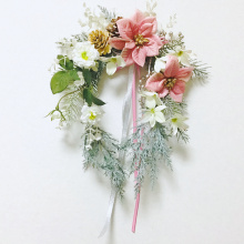 パールピンクのポインセチアをメインに、グレイッシュなモミやファーン、
